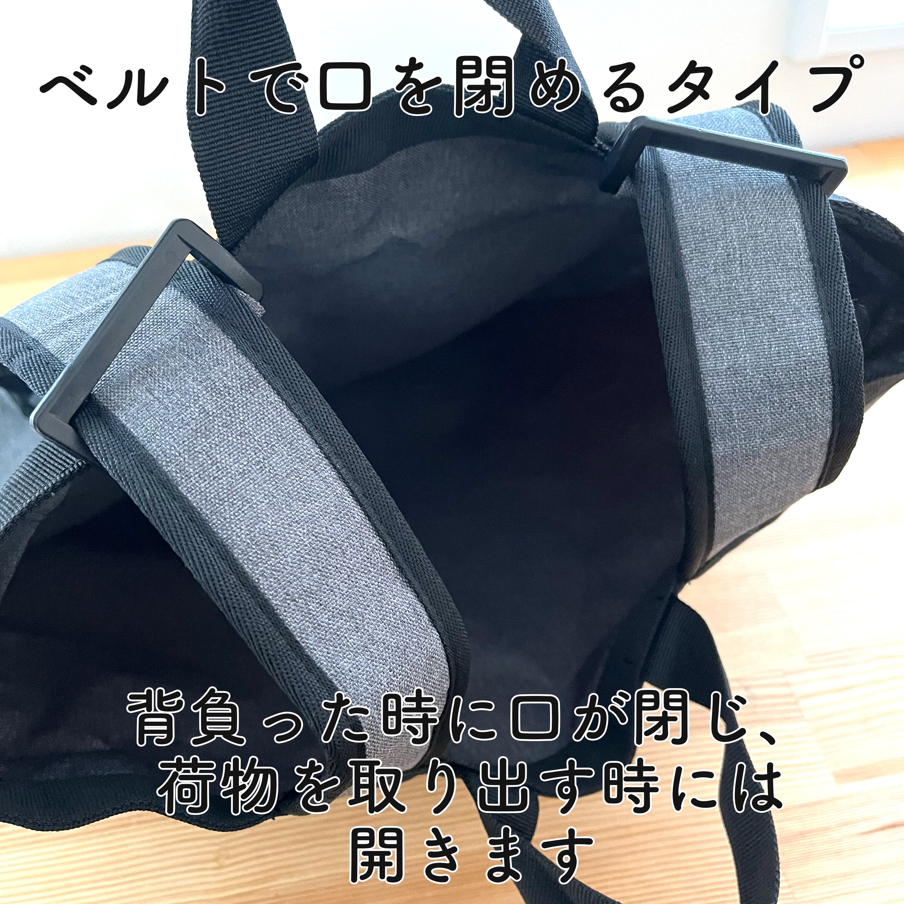 背負ったときにバッグの口が閉じ、荷物を取り出すときに開きます。